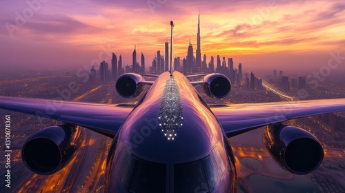 Airplane approaching Dubai sunset; city skyline background; travel, tourism
