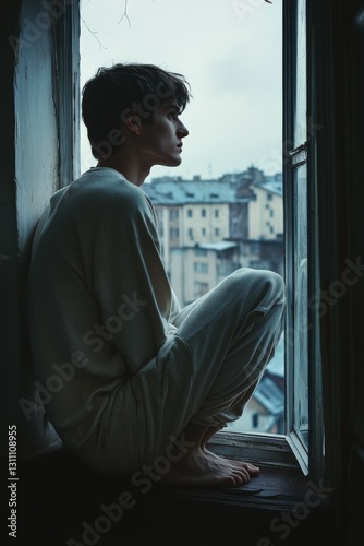 Young man sits by a window in contemplation while gazing at the cityscape during a rainy day