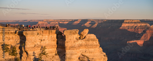 グランド・キャニオンのサウスリム マーサーポイントから朝日を観る観光客 コピースペース