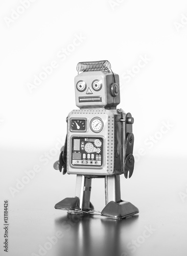 Blechroboter-Spielzeug, Methapher für Chatbot / Socialbot und Algorithmen, Hochformat schwarz weiß
