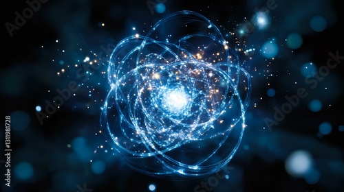 Glowing blue energy sphere with light trails and particles creating dynamic orbital paths against dark background. Abstract cosmic concept shows motion and connectivity.