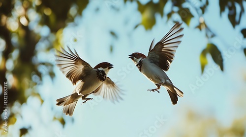 Two sparrows dress in soft, earthy-toned feathers, blending shades of brown, white, and black with delicate streaks and patterns. Their petite bodies are covered in a fine layer of plumage, complement