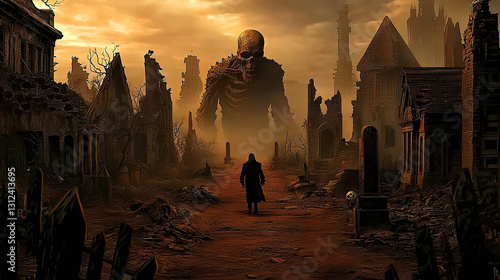 Features a hooded Grim Reaper with a skull skeleton and undead dark fantasy theme. Giant Skeleton Overlooking Abandoned Town at Dusk