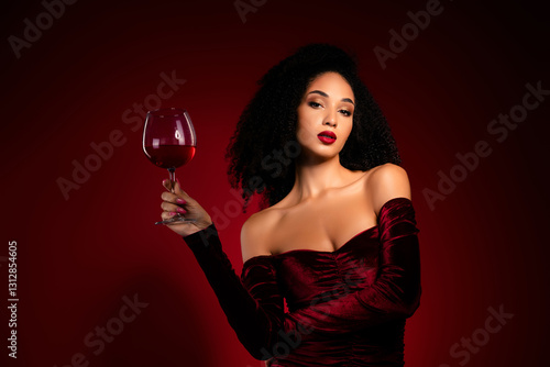 Pretty lady posing looking flirty tempting holding wineglass on red bright color background
