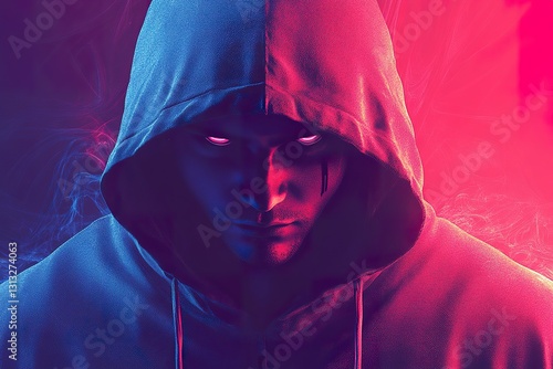 A man with glowing eyes wearing a hooded sweatshirt stares