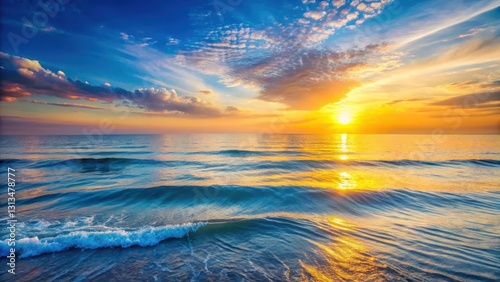 A serene ocean scene at sunset with gentle waves and soft golden light on a calm blue ocean background, waves, sky