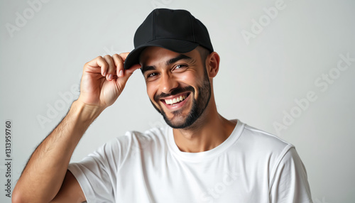 Happy smiling man wears black cap and white t-shirt on clean white background. Guy holds visor with hand. Fashionable trendy baseball cap mockup for brand advertising, promo campaign.