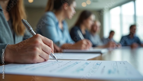 Close-up of people writing on feedback forms at seminar. Attendees measure survey, questionnaire success, providing input for ongoing improvement. Reviewing results, participation, tracking, scoring,