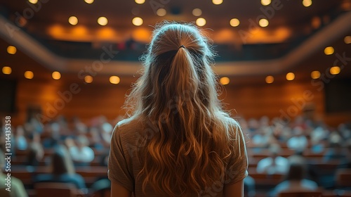 Woman delivering a keynote presentation on global business trends, international conference, leadership role, influential speaker
