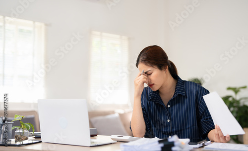 Asian Businesswoman sitting and working hard with computer and lots of documents on the table in living room with serious action, Work hard concept.