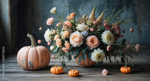 A rustic floral arrangement featuring a pastel pumpkin and flowers, depicted in anime style, standing alone.