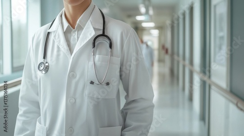 Doctor in white coat standing in a hospital corridor ready to assist patients during a busy day at work