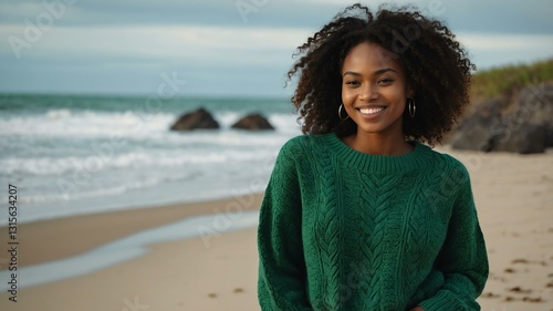 Good-looking young african gal in green themed sweater on a beach smiling