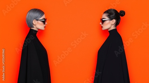Fashionable Women in Black Cloaks Modern Bob Haircuts Sunglasses Orange Background