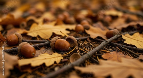 Gathering Acorns Among Fallen Oak Leaves in the Autumn Forest