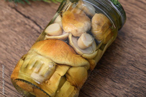 Grzyby marynowane prawdziwki w słoiku z bliska