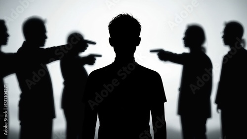 Silhouette of an Individual Surrounded by Pointing Shadows in a Dramatic Accusation Scene