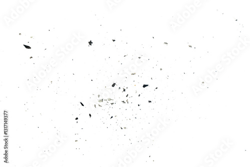 Scattered paper ash particles on white background isolated