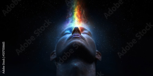 Serene face with vibrant colors emanating from the head in a starlit cosmos.