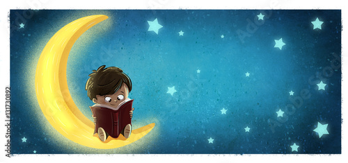Niño leyendo en la luna. Noche estrellada