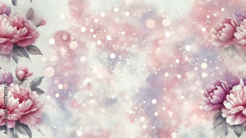 Ein romantisches Blumenarrangement aus rosa und violetten Pfingstrosen mit sanften Lichtpunkten auf einem pastellfarbenen Hintergrund. Zart und verträumt. Generative KI.