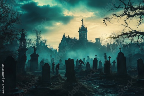 A haunting graveyard scene shrouded in thick fog, capturing ominous tombstones and a silhouetted church. The eerie atmosphere conjures feelings of mystery and the supernatural.