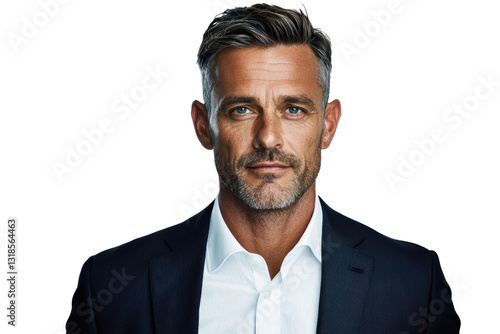 Confident man in suit with short gray hair and blue eyes, exuding professionalism and charisma