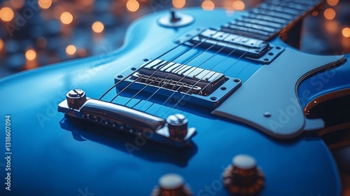 A stunning blue electric guitar rests elegantly amidst warm, glowing lights