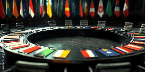 A group of diplomats gathered around a round conference table discussing important international matters.