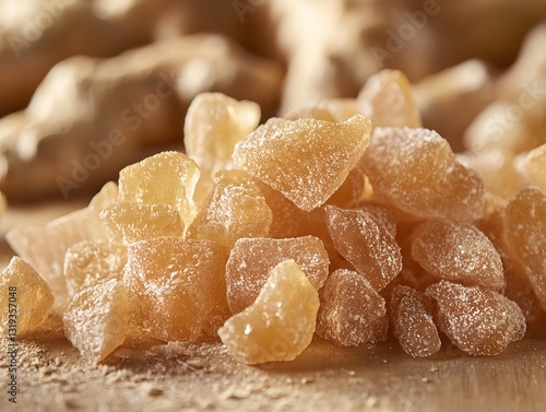 Ginger Candies: A close-up view showcasing a pile of crystallized ginger, the candies glimmering invitingly in the light. Capturing texture and tempting sweetness.