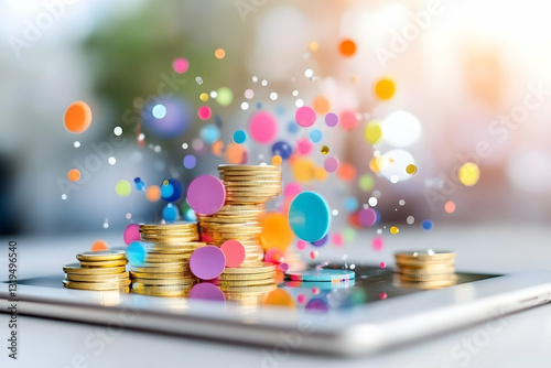 Golden coins stacked on a tablet colorful confetti falling Financial growth concept