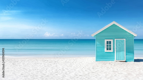 Serene seascape with turquoise shack on empty sandy beach and calm ocean waves. Banner for travel, vacation, escape themes