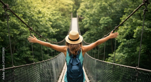 Adventurous woman exploring a suspension bridge amidst lush green scenery