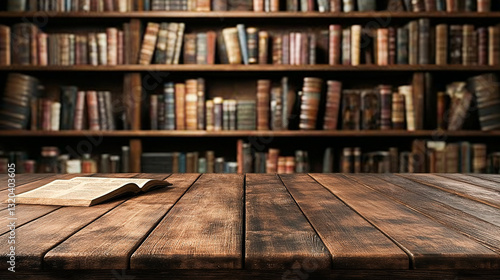 An old wooden table in front of bookshelves filled with books, blurred background