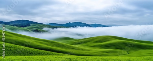 Abstract landscape background concept. Serene green hills under a cloudy sky, showcasing nature's tranquil beauty.
