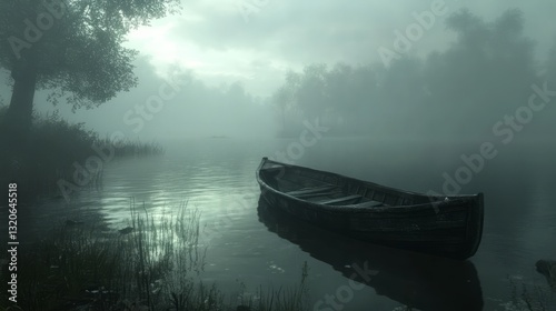 A foggy lake with dark waters, a single old rowboat floating aimlessly, creating an eerie atmosphere