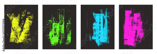 Linocut urban texture. Ink roller brayer background. Grunge letterpress rectangles. Dry yellow, blue and green striped lines on dark background. Painted relief stains. Vector lino eroded illustration.