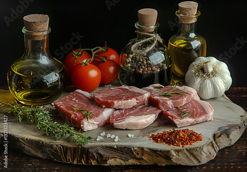 Plastry surowego mięsa z przyprawami, oliwą i warzywami na desce – składniki do przygotowania aromatycznego dania