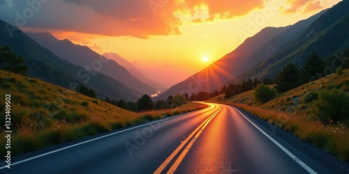 Asphalt ribbon unwinding through majestic mountains bathed in the golden hues of a breathtaking sunset, a scenic drive promising adventure and tranquility