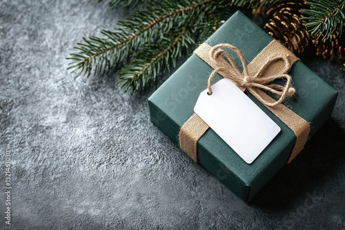 Green Gift Box with Kraft Paper Ribbon and Blank Tag for Christmas or New Year Decoration