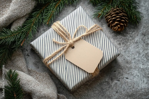 Holiday gift box with blank tag surrounded by festive fir branch on concrete surface in Scandinavian minimalism style