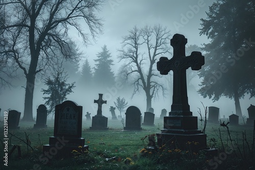 Creepy Graveyard Silhouette with Foggy Halloween Background