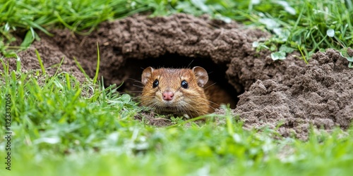 Curious brown vole peeking from its burrow entrance, surrounded by vibrant green grass.