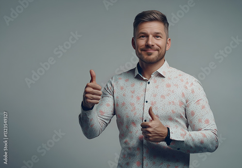 Uśmiechnięty mężczyzna pokazujący gest kciuka w górę na neutralnym tle, pozytywne nastawienie i pewność siebie