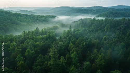 朝霧に包まれた広大な森の空撮風景