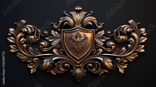 Metallic crest with acanthus leaves and coat-of-arms design, polished bronze look