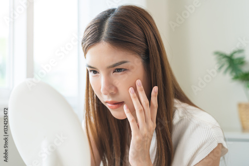 Anti aging, worry puberty asian young woman, stressed girl looking in mirror, allergy presenting an allergic reaction from cosmetic on face. Beauty, health care from acne problem, dry skin, treatment.