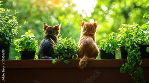 Two cats sit on a ledge surrounded by potted plants, gazing at a vibrant, green garden under soft sunlight.