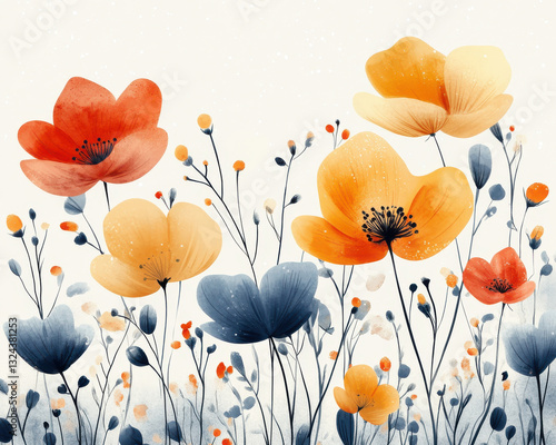 Bright floral illustration with red, yellow, and blue flowers on light background