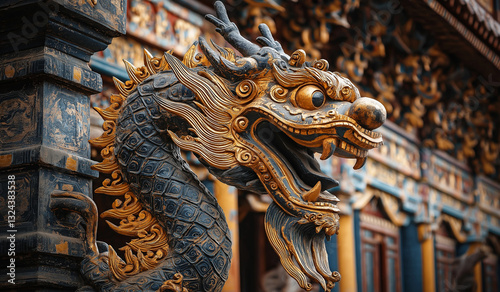 AI generator image of inside a Chinese tomb built around an ancient dragon made of dark sandstone, old tibetan mandala hanging on the a wall of huge and brightly lit highly ornamented tibetan temple